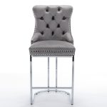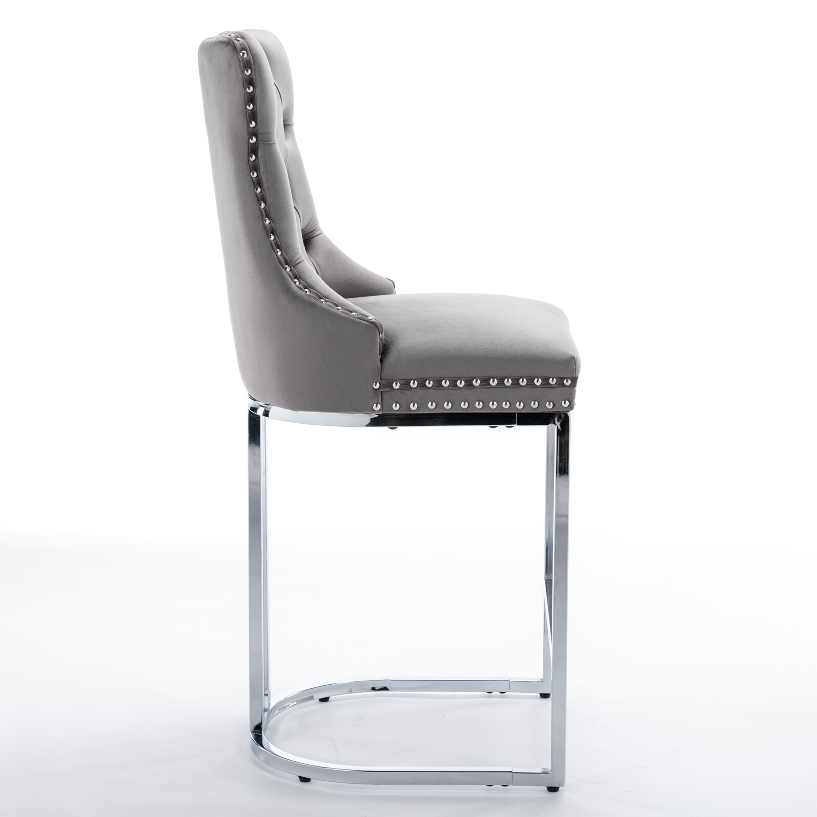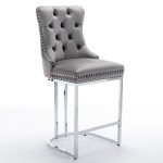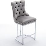 Modern 26″ gray velvet counter height bar stools with button back, rivet trim, and durable chrome metal legs set of 2 for kitchen islands.