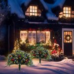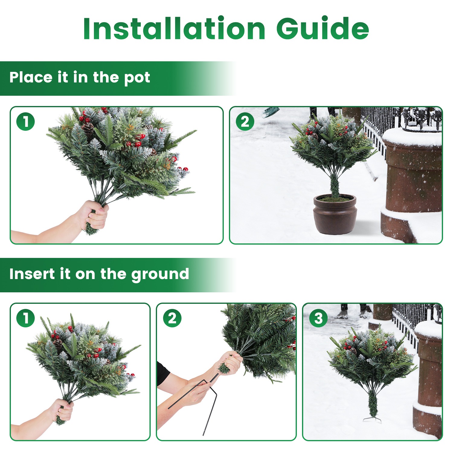 This set includes two artificial Christmas tree urn fillers designed for festive holiday decoration. Each tree features integrated LED lights, cones, and berries for a natural and vibrant appearance. The pine trees are IP44 waterproof rated, ensuring durability for outdoor use in various weather conditions. Equipped with a tripod stake, the urn fillers provide stable placement in planters, pathways, or garden beds. Each tree also features 50 decorative beads, enhancing its holiday charm. These holiday planter fillers offer an elegant and low-maintenance addition to seasonal décor, combining traditional aesthetics with modern lighting technology.