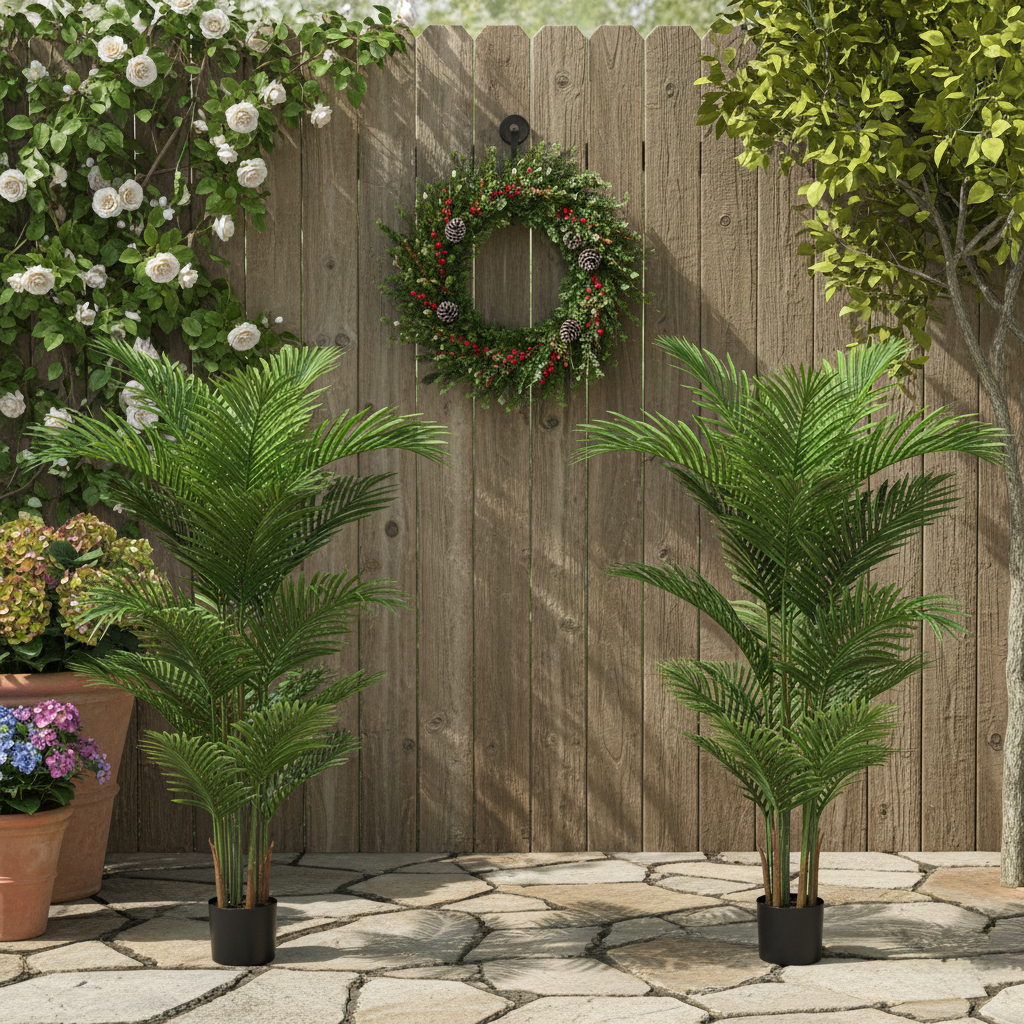 This set includes two 5.2-foot tall artificial palm trees crafted to replicate the natural look of tropical palms. Designed for versatile use, these faux potted plants are suitable for indoor and outdoor settings including homes, offices, and gardens. The realistic foliage and sturdy construction provide an attractive, maintenance-free option to enhance your space with tropical greenery. Perfect for adding a touch of nature without the need for watering or sunlight, these decorative palm trees combine aesthetic appeal with durability for long-lasting use.