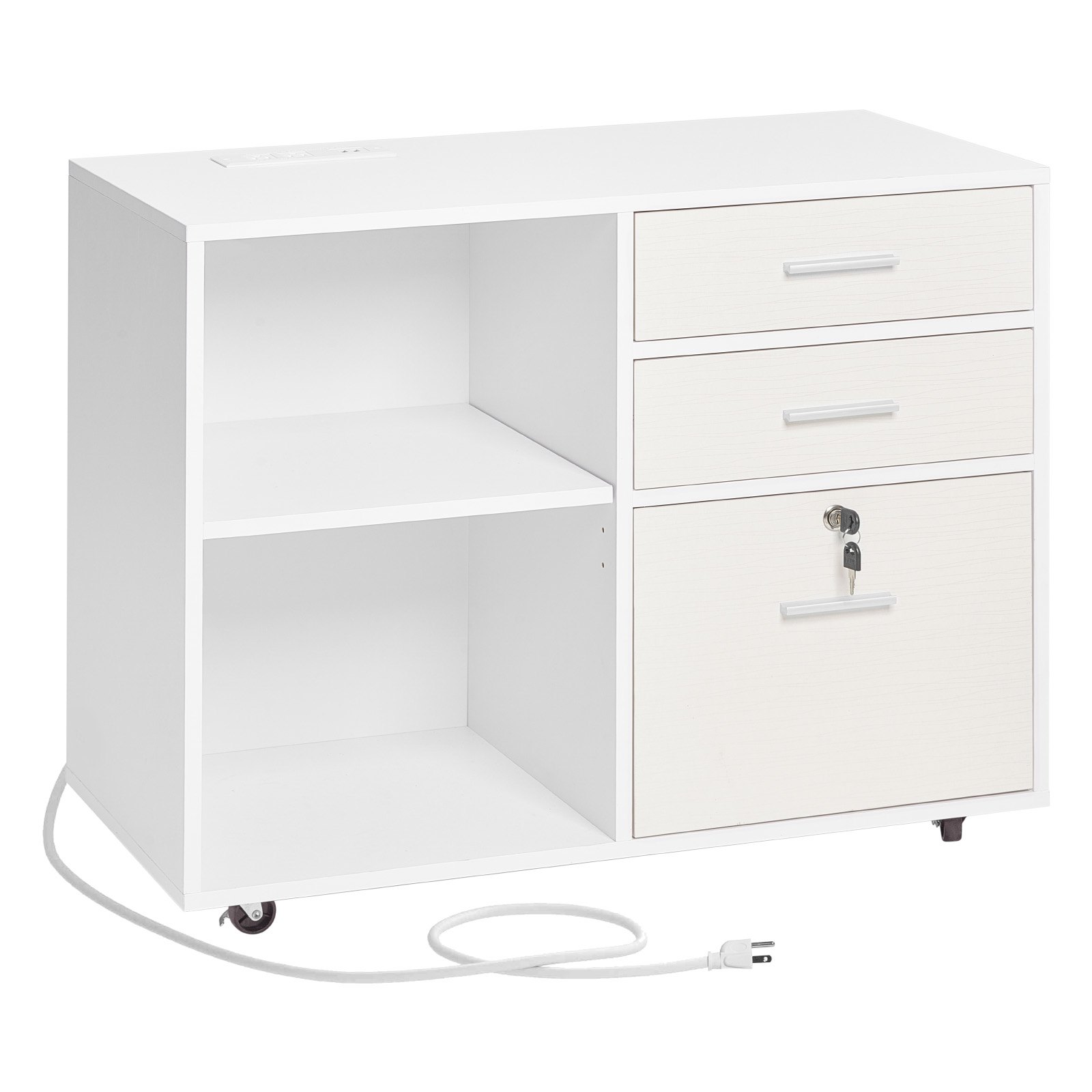 White 3-drawer wooden mobile filing cabinet featuring smooth-rolling wheels and integrated LED light strip for modern office organization.