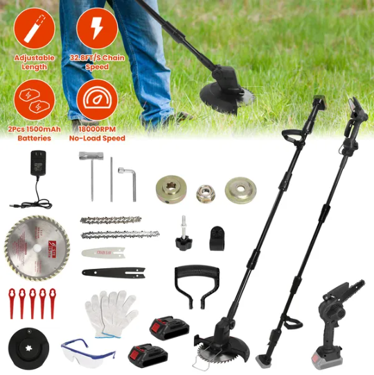This 3-in-1 cordless electric outdoor tool combines a pole saw, mini chainsaw, and grass trimmer into a single versatile kit. Equipped with an adjustable-length pole, it provides extended reach for tree trimming and bush clearing. The kit includes two 21V 1500mAh rechargeable batteries ensuring prolonged operation. It features interchangeable saw blades including 4-inch and 6-inch chainsaw blades for efficient cutting, along with 5 plastic blades for trimming grass and light vegetation. Designed for convenience and multi-functionality, this kit is ideal for gardening, landscaping, and maintenance tasks requiring a compact yet powerful solution.