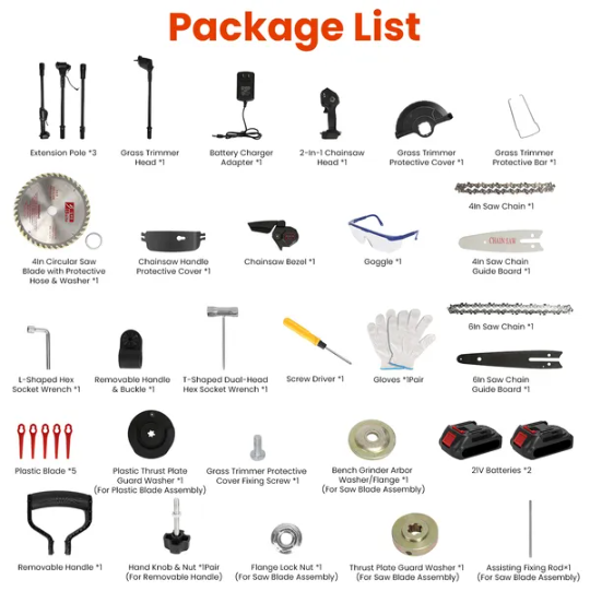 Be the first to review “3-in-1 Cordless Electric Pole Saw & Mini Chainsaw & Grass Trimmer Kit With Adjustable Length 2Pcs 21V 1500mAh Batteries 4in 6in Chains Saw Blade 5Pcs Plastic Blades”
