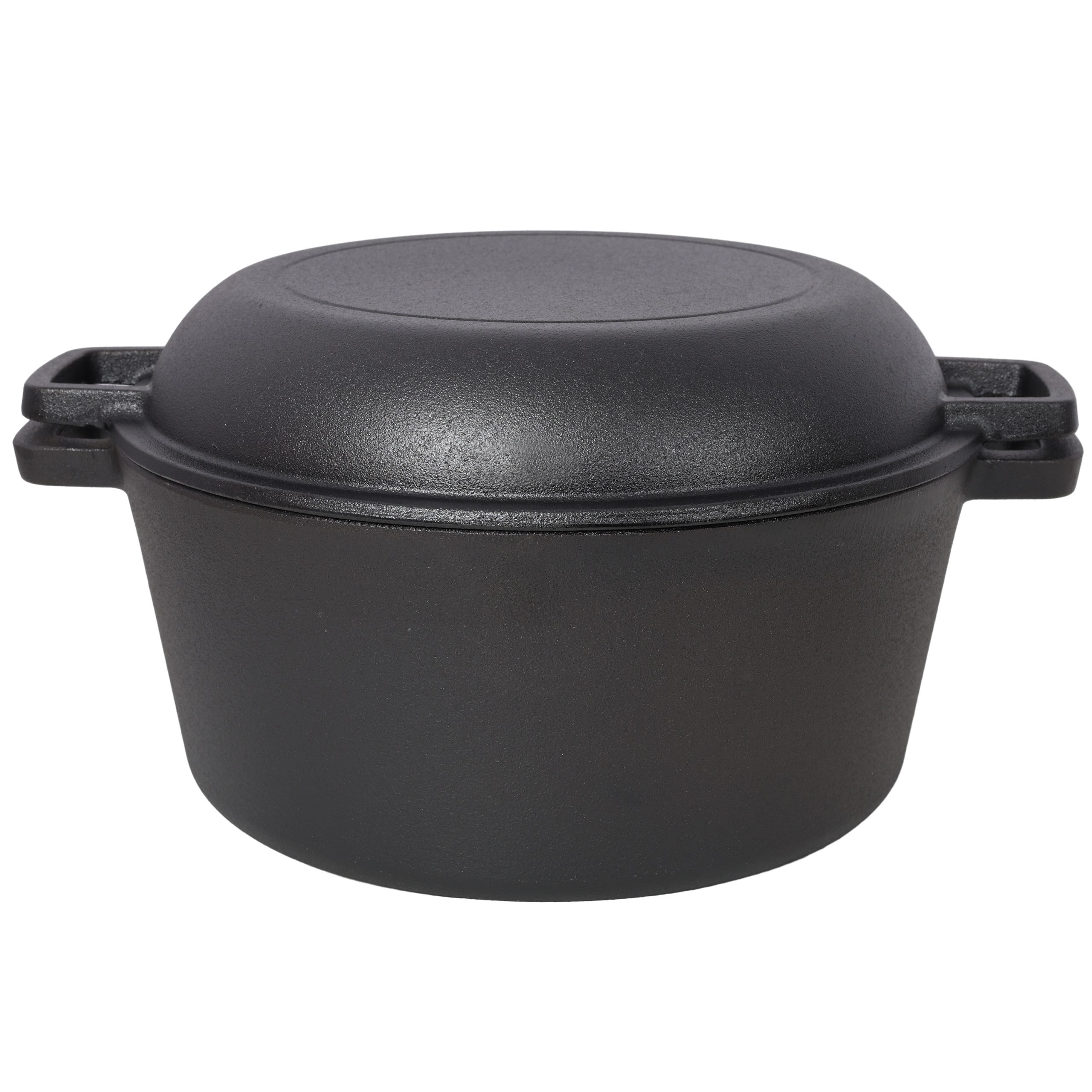 This 3-in-1 pre-seasoned cast iron Dutch oven serves as a versatile cooking solution, ideal for outdoor camping. Its 5-quart capacity allows for deep pot cooking, while the lid doubles as a skillet with a ribbed bottom design for versatile meal preparation. Included are two silicone handle covers for safe handling and one lid lifter to assist with easy and secure removal, enhancing convenience and safety during use. Crafted from durable cast iron, this pot provides excellent heat retention and even cooking performance for various outdoor culinary needs.