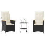 Compact 3-piece black poly rattan bistro set with comfortable cushions, ideal for small patios and balconies.