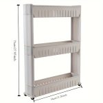 This 3-tier ultra-thin refrigerator side rack is a freestanding storage shelf designed for versatile use in the kitchen, bathroom, or living room. Constructed from durable plastic, it offers a sturdy and long-lasting organizing solution. Its slim profile maximizes space efficiency, fitting neatly beside refrigerators or in narrow areas. Equipped with smooth-rolling wheels, the rack ensures easy mobility for convenient repositioning and cleaning. The three spacious tiers provide ample storage for various household items, supporting an organized and clutter-free environment. This practical organizer combines functionality with a compact design, enhancing storage capabilities in multiple settings.