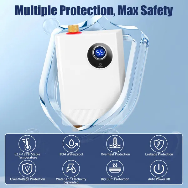 This 3000W electric tankless water heater delivers instant hot water on demand, making it perfect for kitchens, bathrooms, and RV sinks. Featuring a compact and space-saving mini design, it efficiently heats water without the need for a storage tank. The integrated digital display allows precise temperature control and real-time monitoring, ensuring safety and convenience. Designed for easy installation and energy efficiency, this water heater provides a continuous flow of warm water, reducing wait time and water waste. Its robust construction supports reliable performance in various settings, including residential and mobile use.