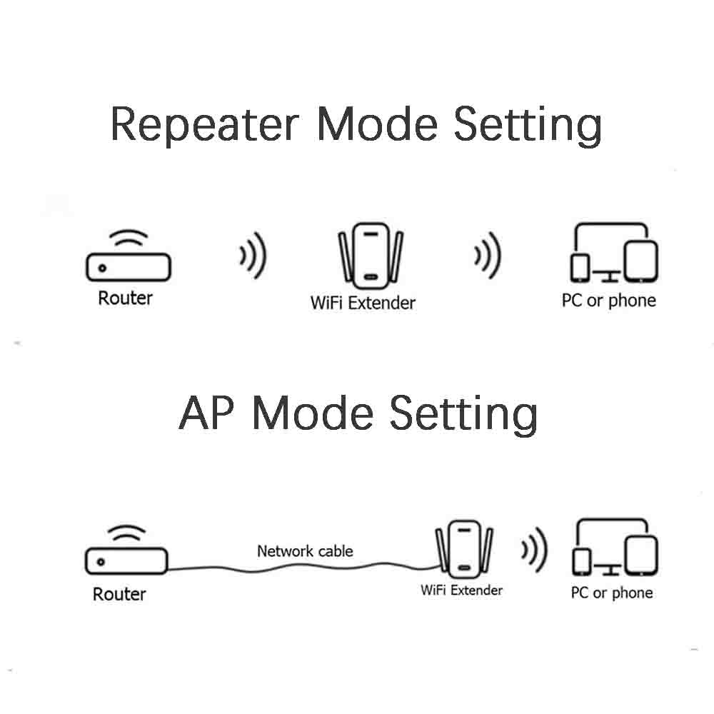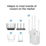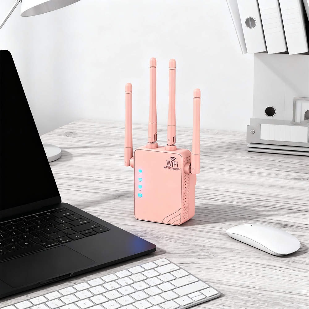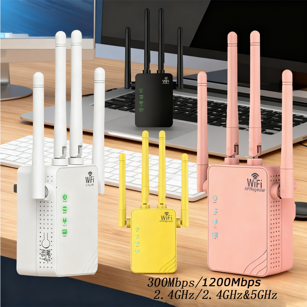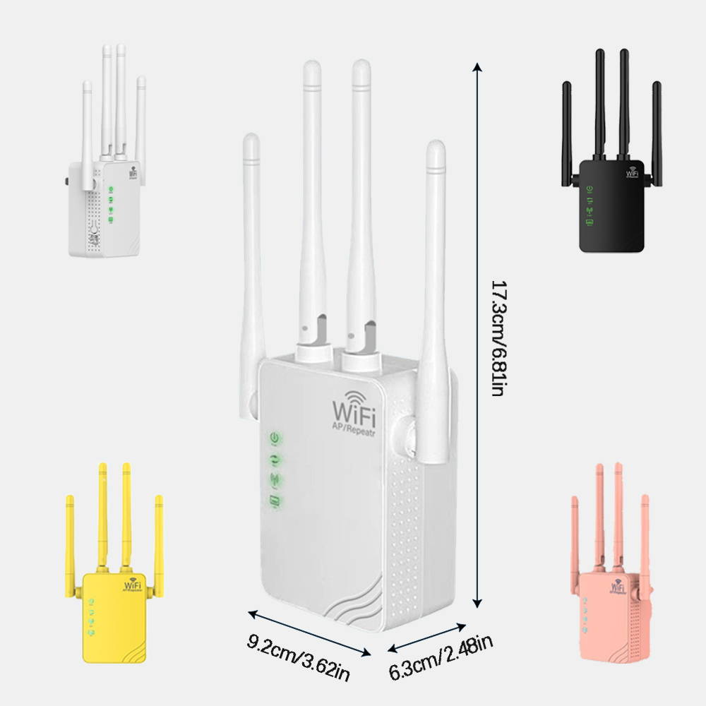 High-speed 1200Mbps dual-band WiFi repeater with 4 antennas, AP mode, ideal for home and office use. Available in multiple colors.
