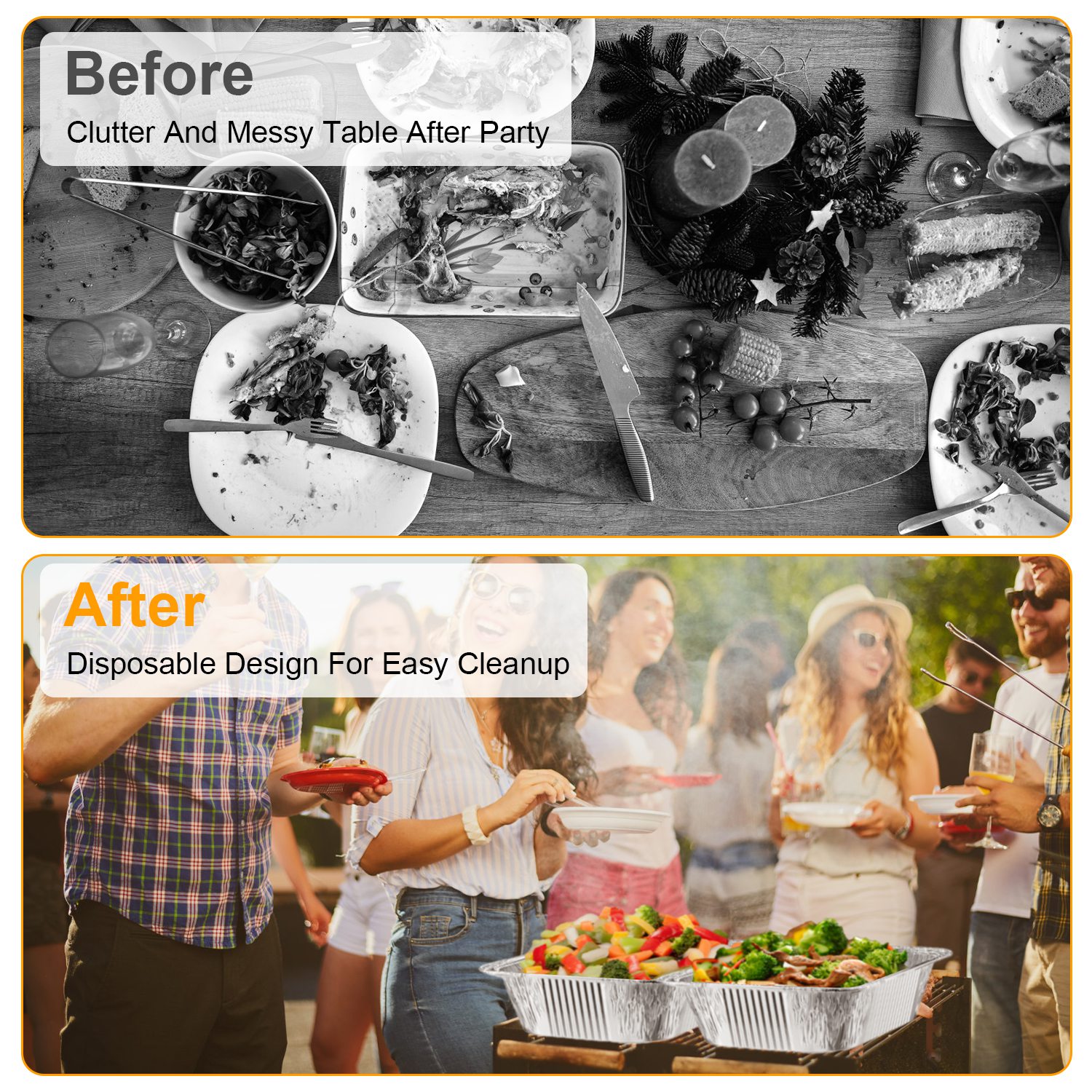 *Food-Safe Material*:Made of premium aluminum foil paper,the pans and lids are food-graded,non-toxic,ensuring both of the catering quality and safety of your friends and family. Moreover,thickened plastic utensils are sturdy enough for effortlessly garbing various kinds of foods.