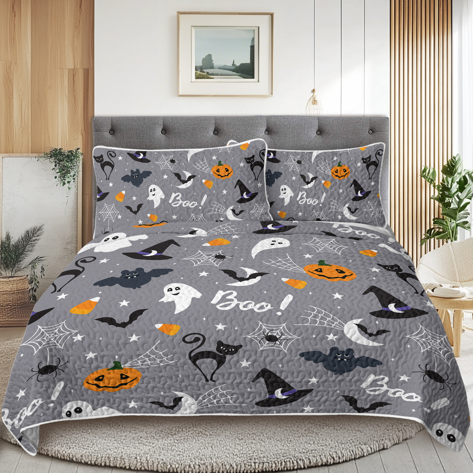 This 3-piece Halloween pumpkin bedding set comprises one soft, lightweight coverlet and two matching pillowcases. Designed with festive pumpkin motifs, it offers a cozy and seasonal addition to bedrooms suitable for girls, boys, and women. The breathable material ensures comfort throughout the night while enhancing holiday décor with a thematic touch.