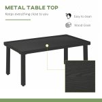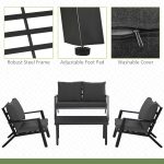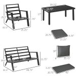 Serve dinner and bring the comforts of the living room to your backyard with Outsunny. This four-piece outside table and chairs set brings everything together. Featuring a loveseat sofa, two chairs, and a center table for friends to drink, have dinner, and decorate. Each seat has thickly padded cushions and ample armrests. Have the rustic look of wood outside. Made of strong steel for heavy-duty resistance to bending and a high weight capacity, this was built with outdoor in mind. Features: – Four-piece backyard furniture set with two armchairs, a sofa loveseat, and a coffee table – Incline backrest and ample armrests to better support your body – Thick, soft cushions offers great comfort – Heavy-duty steel frame for strong foundation – Metal tabletop with wood grain pattern is easy to clean yet stylish – Adjustable foot pads to stay stable and stop scratching – Assembly required Specification: – Color: Black Frames, Grey Cushions – Material: Steel, Polyester, Sponge – Loveseat Dimensions: 48.75″ W x 31.5″ D x 29.5″ H – Single Armchair Dimensions: 25.25″ W x 31.5″ D x 29.5″ H – Coffee Table Dimensions: 39.25″ L x 19.75″ W x 17″ H – Seat Size: 21.25″ W x 20.75″ D (single chair), 45″ W x 20.75″ D (loveseat) – Seat Height (excluding seat cushion): 13″ H – Back Size: 20″ L x 21.25″ W x 15.25″ H (single), 20″ L x 45″ W x 15.25″ H – Weight Capacity: 704 lbs. (loveseat), 352 lbs. (single sofa), 66 lbs. (coffee table) – Item Label: 84B-771 Package Includes: – 2 x Armchair – 1 x Loveseat – 1 x Coffee Table – 7 x Cushion – 1 x Manual.