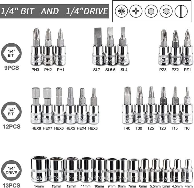 21PCS – BIT SOCKETS: SL4, 5.5, 7 PH1, 2, 3 PZ1, 2, 3, HEX3, 4, 5, 6, 7, 8 T10, 15, 20, 25, 30, 40