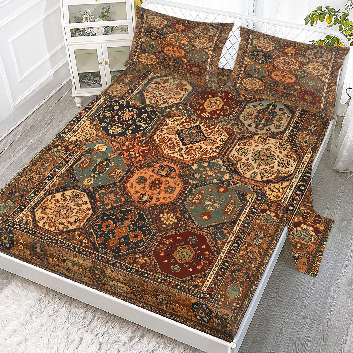 4-piece retro Bohemian geometric bedding set with fitted sheet, flat sheet, and two pillowcases for year-round comfort and style.