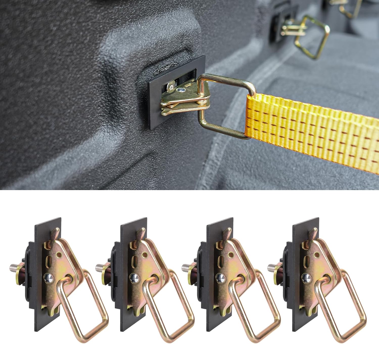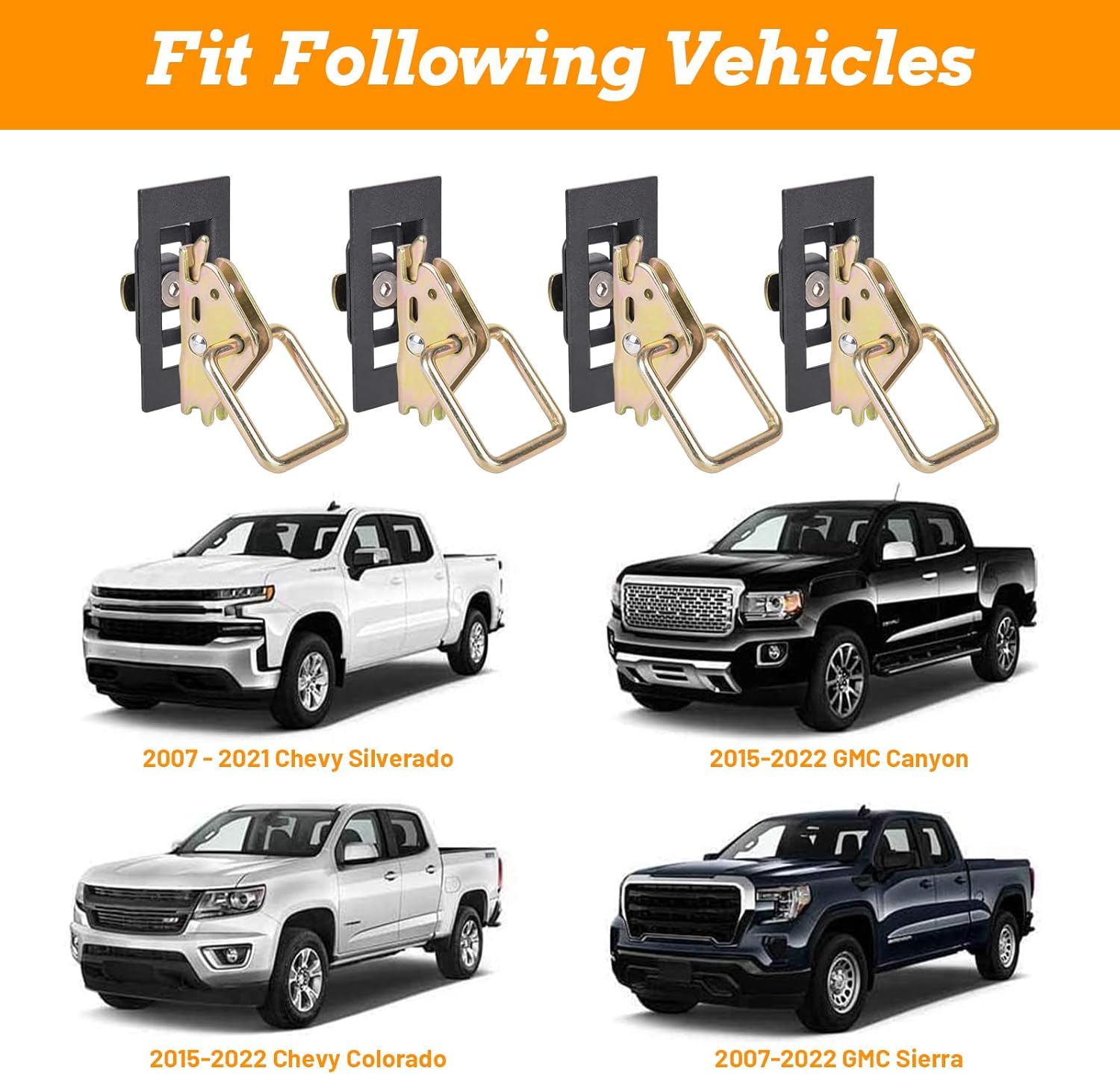 Durable 4-piece tie down anchors for Chevy Silverado, GMC Sierra, Chevy Colorado, and GMC Canyon trucks, model years 2007-2022.