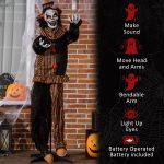 Realistic 5.6-foot animatronic clown decoration for outdoor Halloween displays featuring glowing eyes and lifelike movements.
