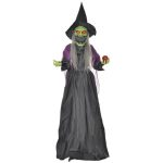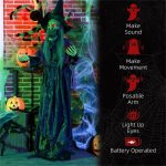 5.9-foot animatronic old witch Halloween decoration with sound activation, motion sensor, and glowing eyes for outdoor spooky ambiance.