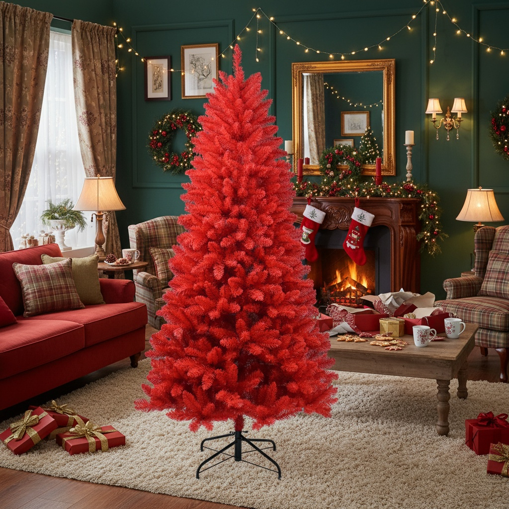 This 5-foot red Christmas tree is crafted from high-quality PVC, presenting a natural appearance with 624 detailed tips. Designed with hinged branches for effortless assembly and shaping, it stands firmly on a stable metal base to ensure reliable support. Ideal for holiday celebrations and party decor, this artificial tree combines durability with convenience, making it a reliable centerpiece for festive environments.