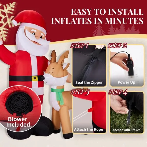 Brighten your holiday with a 6.3FT inflatable Santa and reindeer featuring built-in LED lights, ideal for yard, lawn, and garden decor.