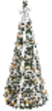 This 6-foot pop-up Christmas tree is adorned with 12 gold balls, 12 red flowers, 12 golden flowers, 12 small red bows, and 1 large red bow. It also includes a 6-foot decorative ribbon to enhance its festive appearance. The assorted ornaments create a vibrant and elegant holiday decoration, perfect for indoor display.