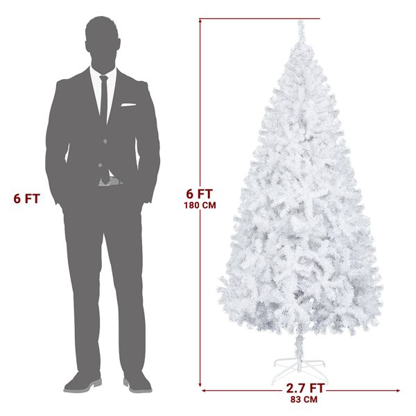 6-foot white artificial Christmas tree featuring 800 branch tips and a durable metal stand for stable holiday décor.