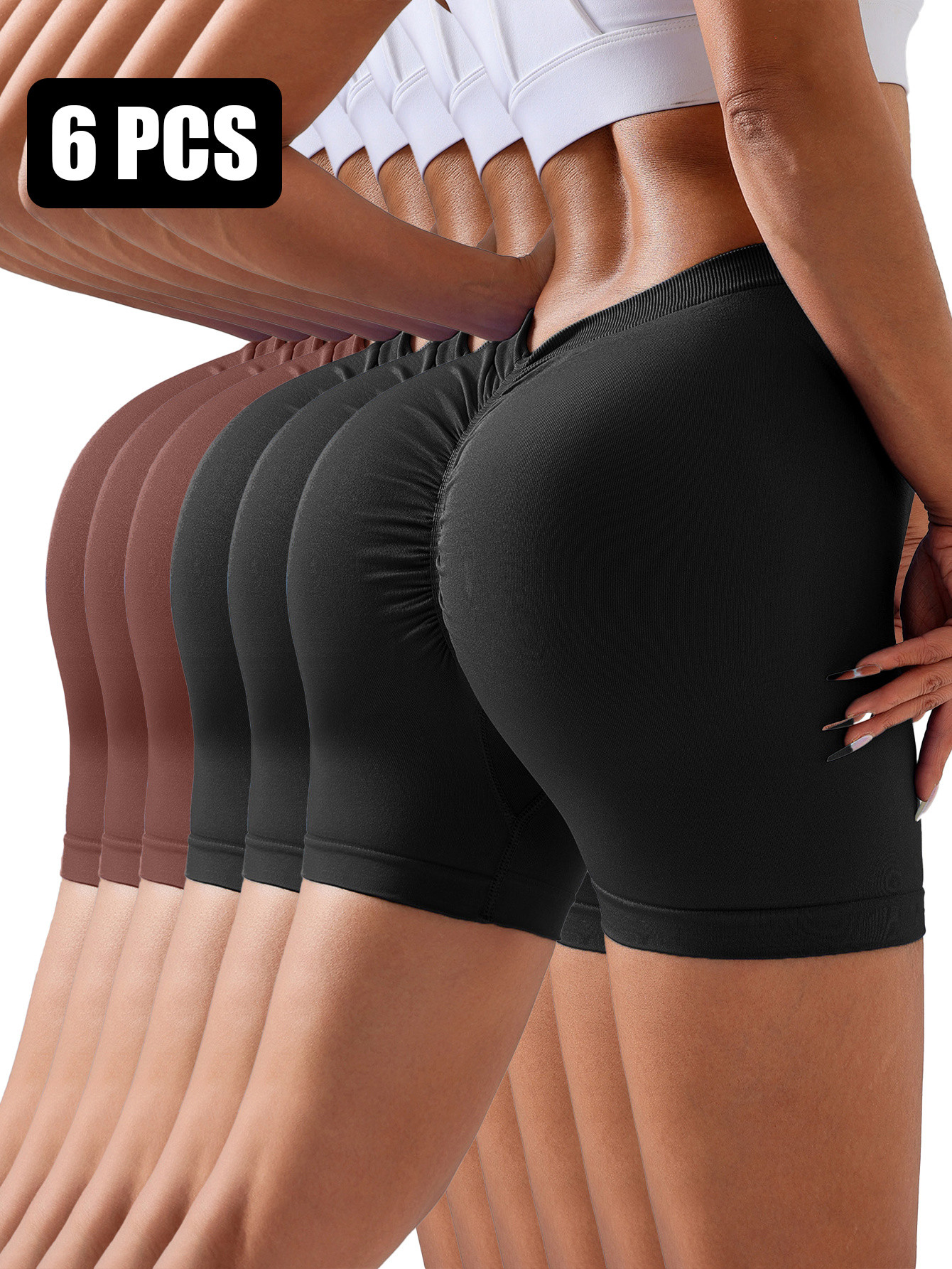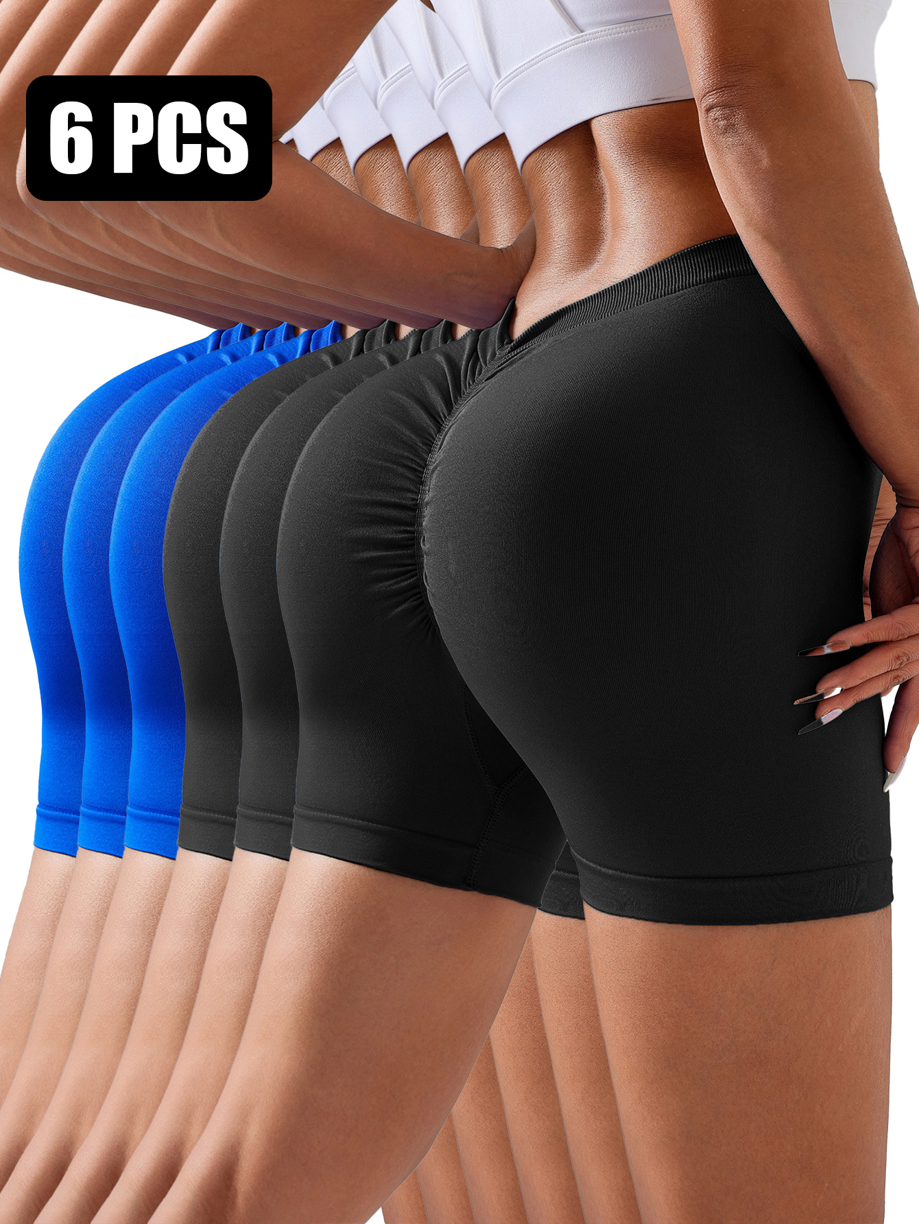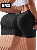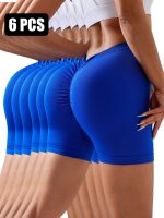 Set of 6 seamless, solid color V-back women’s gym shorts with scrunch butt design, perfect for running, cycling, and workout sessions.