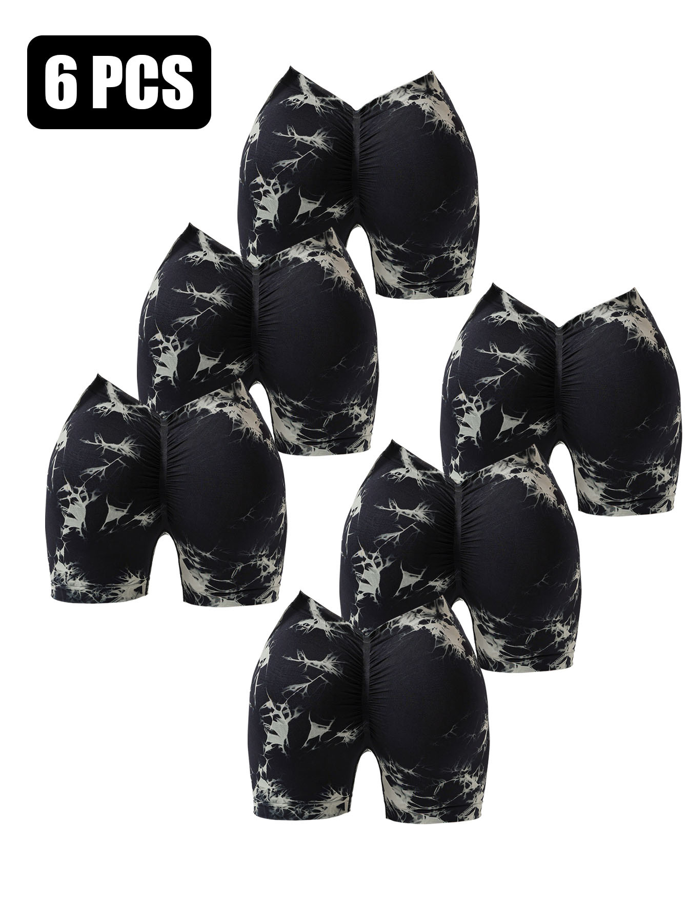 Set of 6 women’s tie dye gym shorts featuring scrunch butt design for enhanced lift and comfort during workouts.