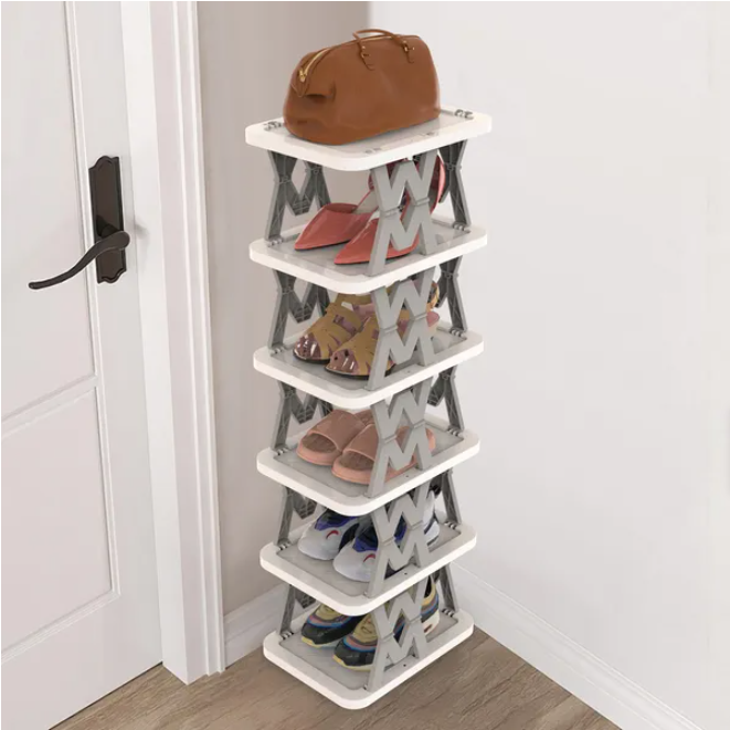 This 6-tier foldable shoe rack features a vertical and narrow design ideal for compact spaces. Constructed from sturdy materials, it offers durable and reliable storage for multiple pairs of shoes. Its foldable nature allows for easy assembly and convenient portability, making it suitable for various rooms and entryways. The organizer optimizes floor space while maintaining accessibility, helping to keep footwear neatly arranged and readily available.