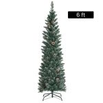 6FT green artificial Christmas tree featuring 267 lush tips, 31 realistic pine cones, and a foldable metal stand for easy setup and storage.