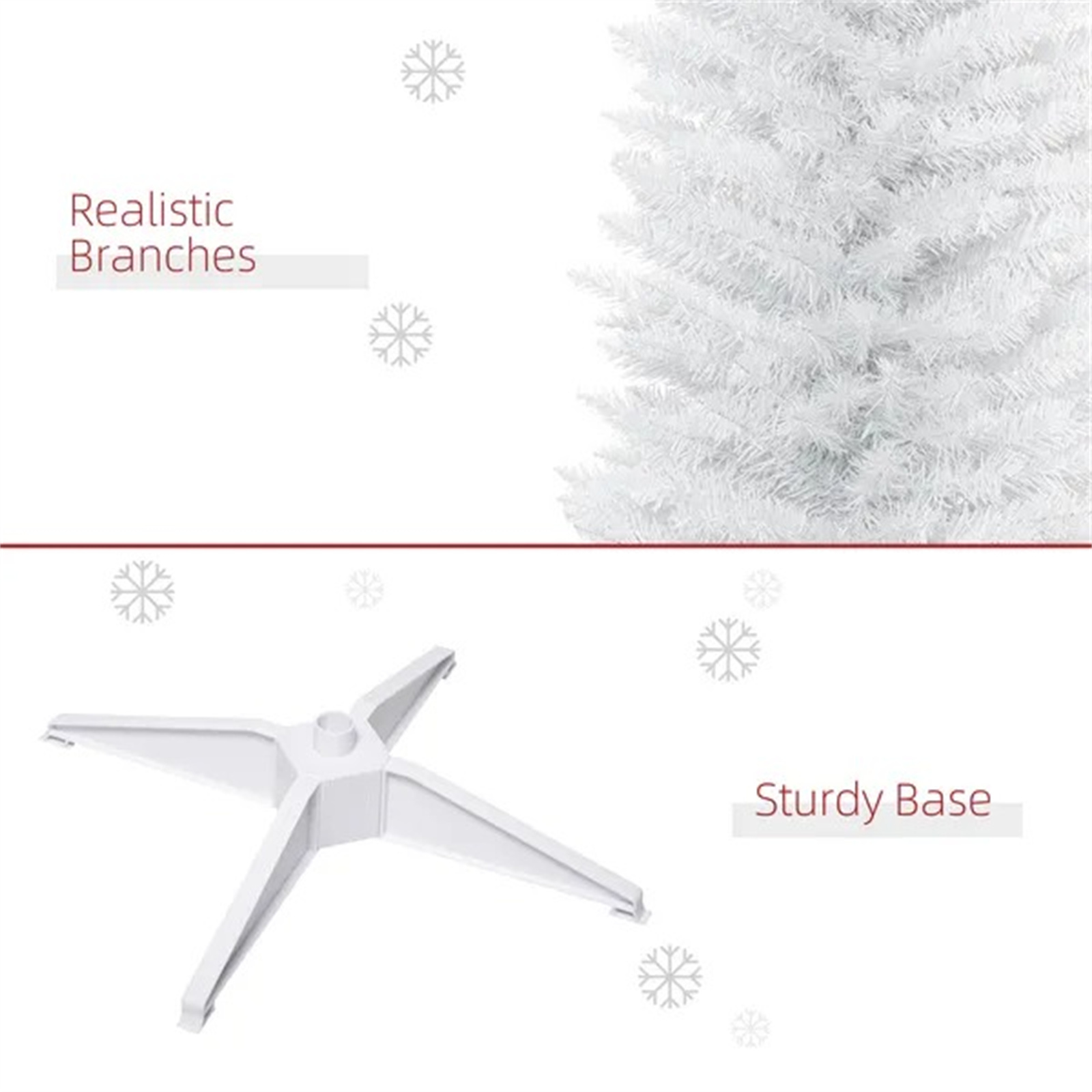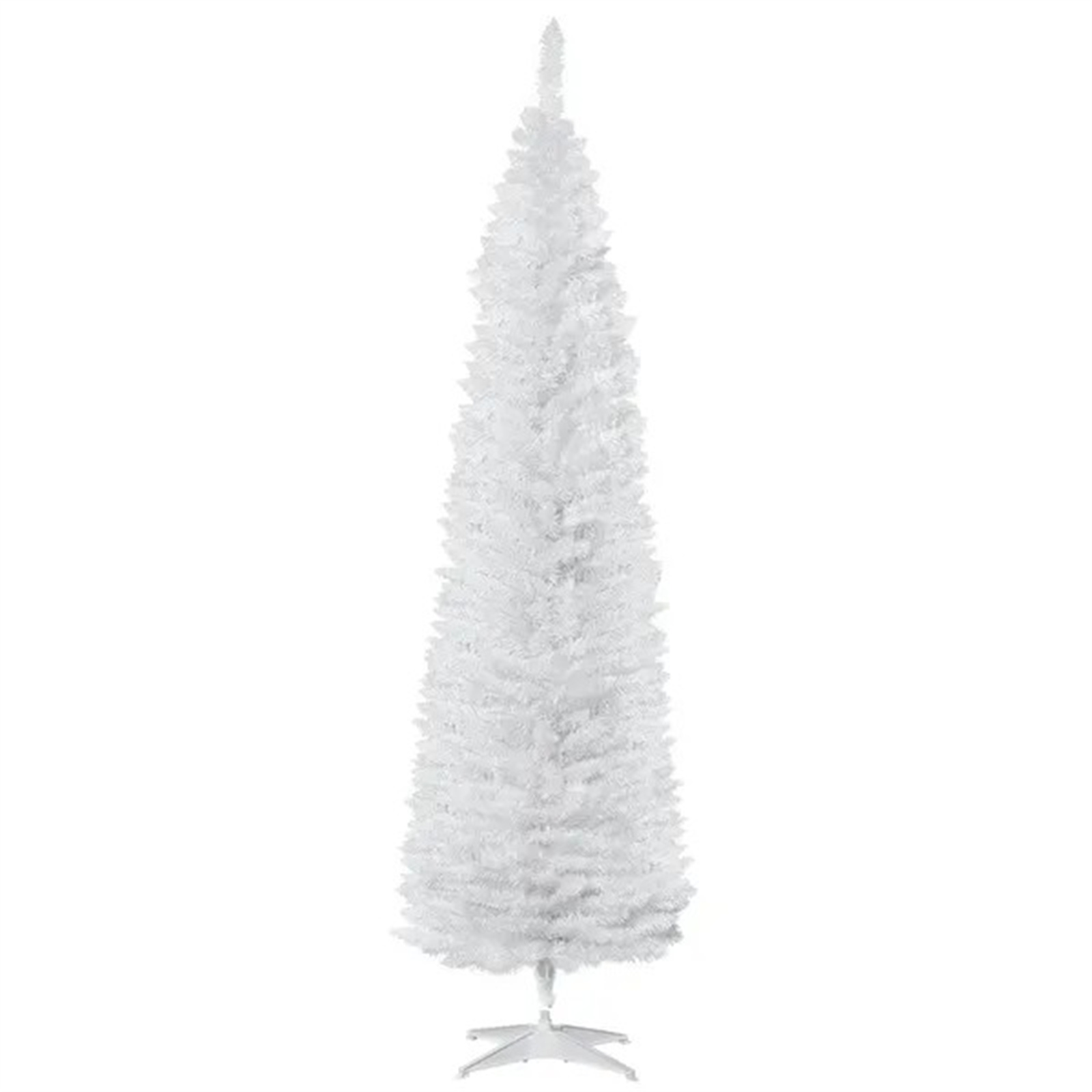 This 7-foot slim pencil Christmas tree offers a natural white finish with highly realistic branches crafted to imitate genuine foliage. Designed for a sleek holiday display, the artificial tree maintains a streamlined silhouette suitable for limited spaces. It includes a robust metal stand that ensures stable placement throughout the festive season. Ideal for enhancing seasonal decor with an elegant and space-conscious design, this tree combines aesthetic appeal with durable construction.