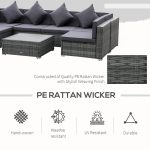 This 7-piece patio furniture set features a durable PE rattan sectional sofa designed for outdoor use, complemented by comfortable cushions for enhanced seating. The set includes a coffee table with a sturdy acacia wood top, offering a natural and stylish accent to any garden or backyard. The neutral grey color blends seamlessly with various outdoor decors. Crafted to withstand the elements, this sectional set provides a cozy and elegant outdoor conversation area, perfect for hosting or relaxing in your outdoor space.