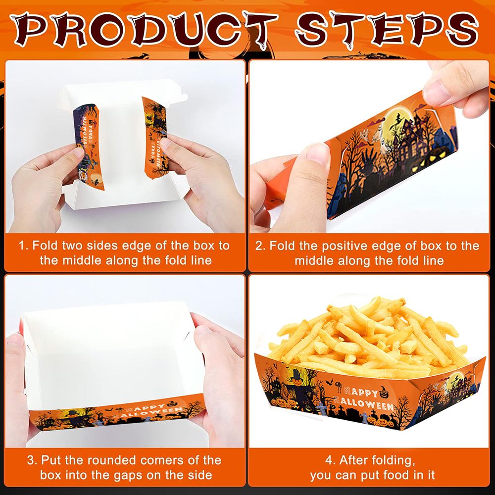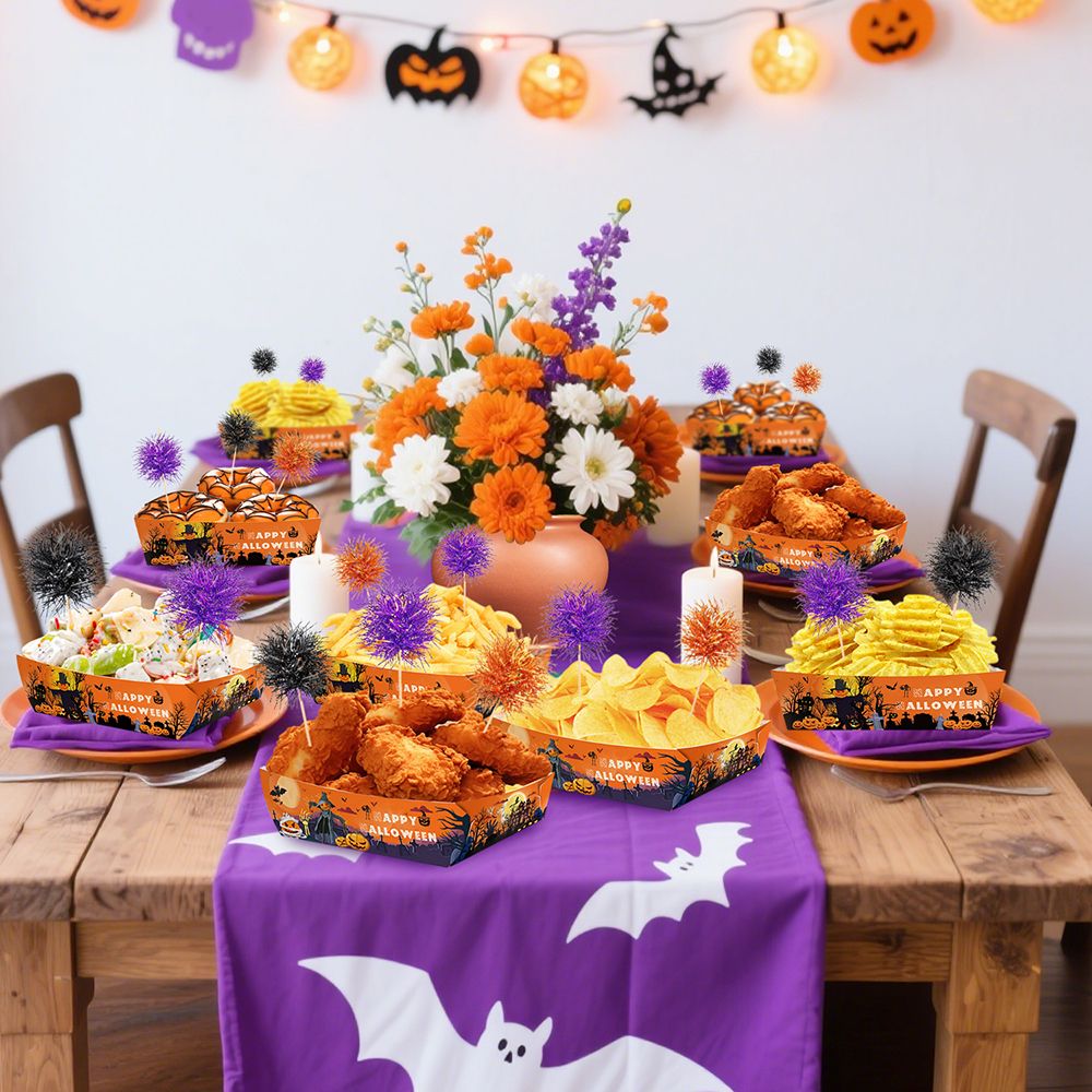 This Halloween party set includes 72 disposable paper food trays designed for convenient and hygienic food serving during Halloween events. The set also features 60 firework-themed party picks, ideal for food storage and enhancing charcuterie board presentations. Crafted from durable, food-safe paper materials, these trays provide an efficient solution for organizing and displaying snacks, appetizers, and treats. The combination of trays and picks facilitates easy serving and adds decorative flair, making it suitable for parties, gatherings, and festive celebrations.