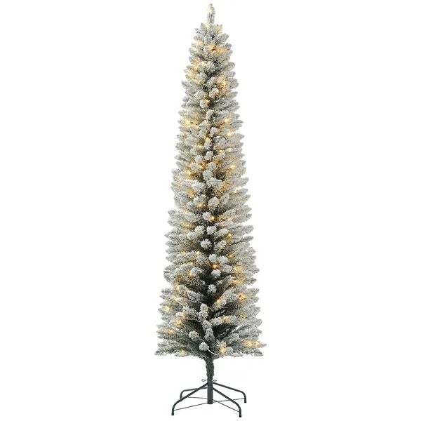 7ft artificial prelit Christmas tree featuring warm white LED lights, snow flocked branches, and sturdy metal base. Perfect pencil-shaped Xmas decoration.