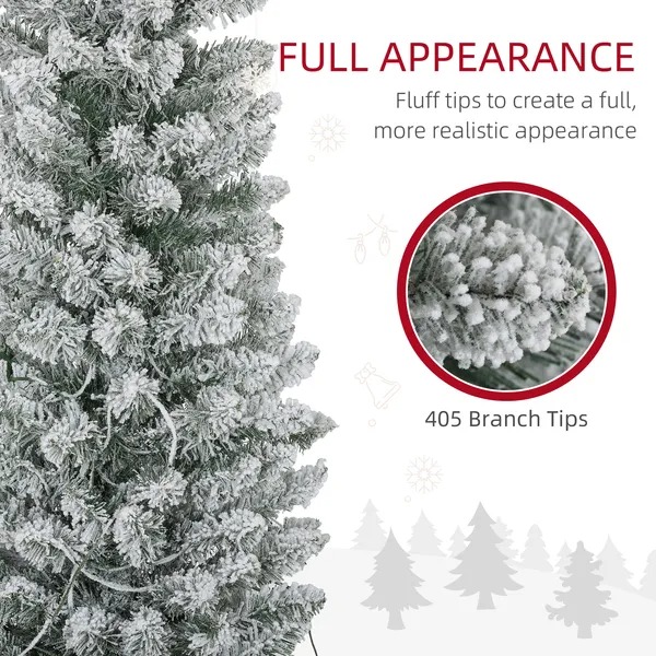This 7-foot artificial Christmas tree offers a classic pencil shape with snow flocked branches for a festive winter appearance. Equipped with warm white LED lights pre-installed for a cozy ambiance, it requires no additional setup. The tree stands securely on a durable metal base, ensuring stability throughout the holiday season. Ideal for compact spaces, this prelit tree combines elegance and convenience for seasonal décor.