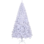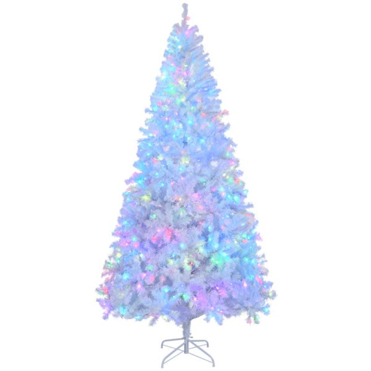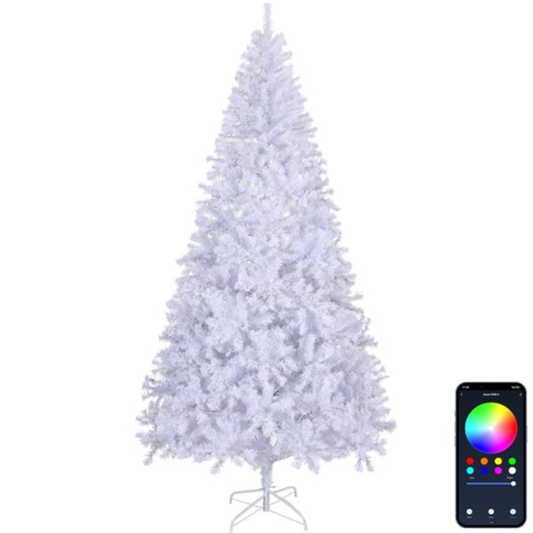 8-foot white artificial Christmas tree with APP-controlled RGB lights, hinged branches, and 1500 tips, perfect for holiday décor at home or office.