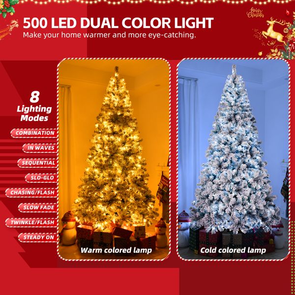 Snow flocked 8-foot artificial Christmas tree with 1300 branch tips, 500 LED lights, and remote control for indoor holiday decor.