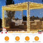 Dimmable 192LED solar Christmas net lights, IP44 waterproof with 8 modes, timer, memory function for outdoor décor and events.