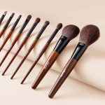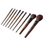 Complete 9-piece makeup brush kit featuring soft natural wool, vegan synthetic bristles, ergonomic wood handles, and a travel-friendly storage bag.