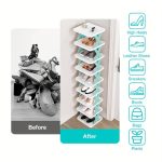 This 9-tier shoe rack features a robust steel frame designed to provide ample storage space for footwear. Its multi-level shelves allow for the organized placement of numerous shoe pairs, optimizing space in entryways, closets, or bedrooms. The rack’s sturdy construction ensures long-lasting durability, supporting heavy loads without compromising stability. Its compact design facilitates efficient use of available floor area while maintaining easy access to shoes. Suitable for a variety of home environments, this shoe rack combines practicality with a minimalist aesthetic.