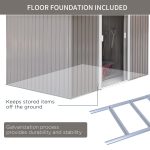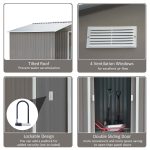 Easily add storage space and value to your property with an outdoor garden shed from Outsunny. The metal tool storage shed has distinct advantages over traditional wooden models that make it a much more attractive choice for purchase. Out garden storage shed is more affordable and being pre-fabricated significantly cuts down on expenses. A metal shed is more durable and offers better protection from hazards. If you’ve been looking for a way to add much-needed storage space to your property but don’t want to deal with the cost and upkeep of a traditional wooden model, this backyard storage shed can be your perfect choice. Features: – Spacious storage area for garden tools, lawn care equipment, pool supplies and more – Built from the finest color steel and durable polypropylene (PP) construction – Sloped roof prevents water gathering and resists bad weather – Double sliding doors for easy entrance and access – 4 vents for increased lighting and airflow – Assembly required Specification: – Color: Grey, White – Materials: Color Steel, PP – Overall Dimensions: 9.1′ L x 6.4′ W x 6.3′ H – Inside Dimensions: 8.8′ L x 6′ W x 6.3′ H – Wall Height: 5′ – Door Dimensions: 3.1′ L x 5′ H – Vent Dimensions: 8.5″ L x 3.75″ W – Steel Wall Thickness: .25mm / 30 Gauge – Steel Foundation Thickness: .45 mm / 25 Gauge Easily add storage space and value to your property with an outdoor garden shed from Outsunny. An Outsunny metal shed has distinct advantages over traditional wooden models that make it a much more attractive choice for purchase. It all comes down to affordability and durability. A metal shed is more affordable and, being pre-fabricated, significantly cuts down on expenses. Our Outsunny storage shed comes delivered to you as a kit that is needed to put together. A metal shed is more durable and offers better protection from hazards such as fire. Our Outsunny shed comes with a powder coating surface and a sturdy foundation with reinforced walls that make it easy to maintain. If you’ve been looking for a way to add much-needed storage space to your property but don’t want to deal with the cost and upkeep of a traditional wooden model, then look no further than ‘this metal storage shed from Outsunny. Features: – Spacious storage space for garden tools, outdoor tools, equipment, and gardening gear – Made with the finest galvanized steel and durable polypropylene (PP) for long-lasting use – Sloped roof prevents water gathering and resists bad weather – Double sliding doors for easy entrance and access – 4 vents for increased lighting and airflow – Assembly required, the floor frame is also included, please use gloves when installing Specification: – Color: Grey, White – Materials: Galvanized Steel, PP – Overall Dimensions: 6.97′ L x 4.3′ W x 6.06′ H – Inside Dimensions: 6.7′ L x 3.8′ W x 6′ H – Wall Height: 5.1’ – Door Dimensions: 37.75″ L x 59.75″ H – Vent Dimensions: 8.5″ L x 3.75″ W.