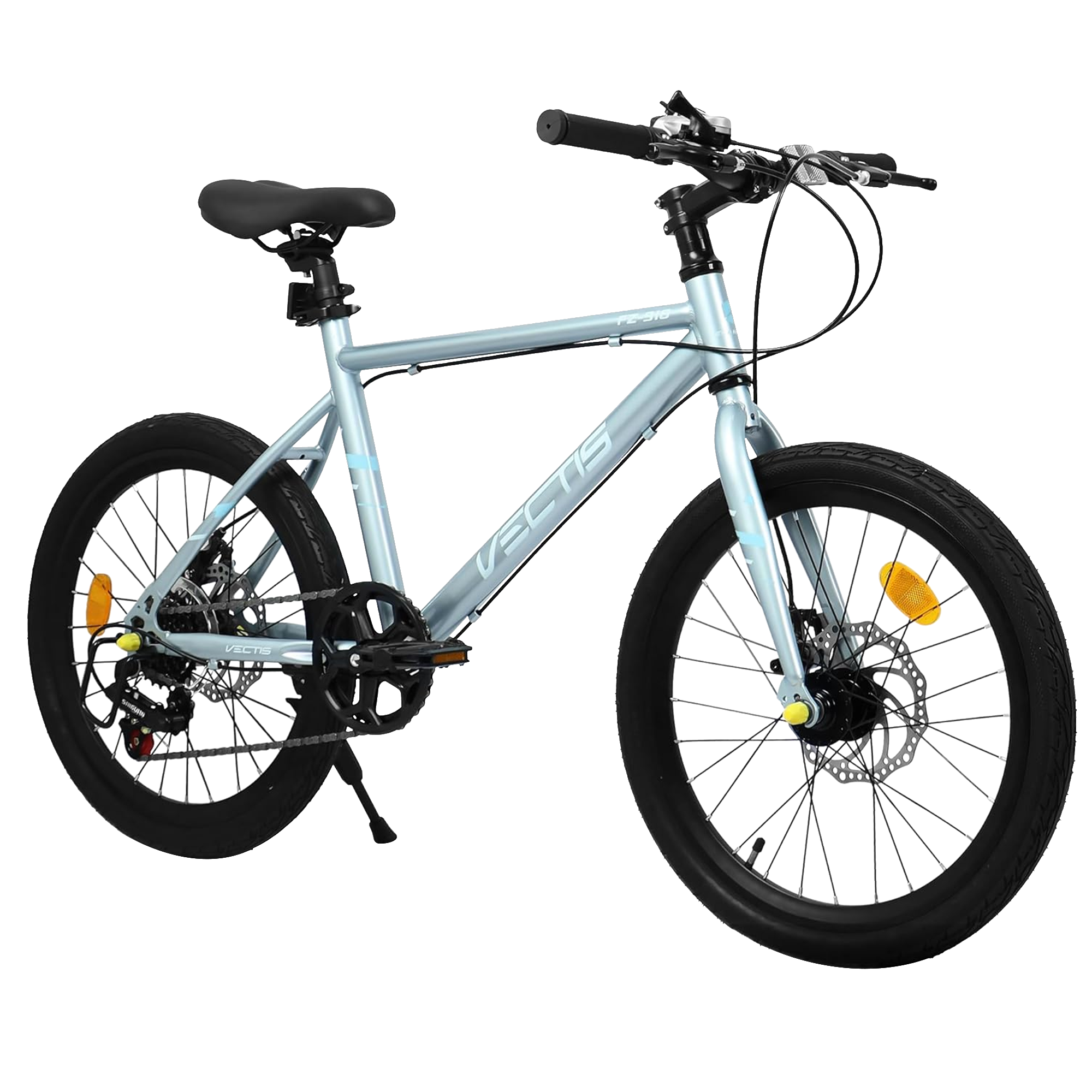 Durable 20-inch kids bike with 7-speed gears, dual disc brakes, and 20×1.75 tires. Suitable for ages 6-12, available in four colors.