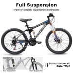 Durable 24-inch mountain bike with full suspension, 21-speed shifter, mechanical disc brakes, and high carbon steel frame for men and women.