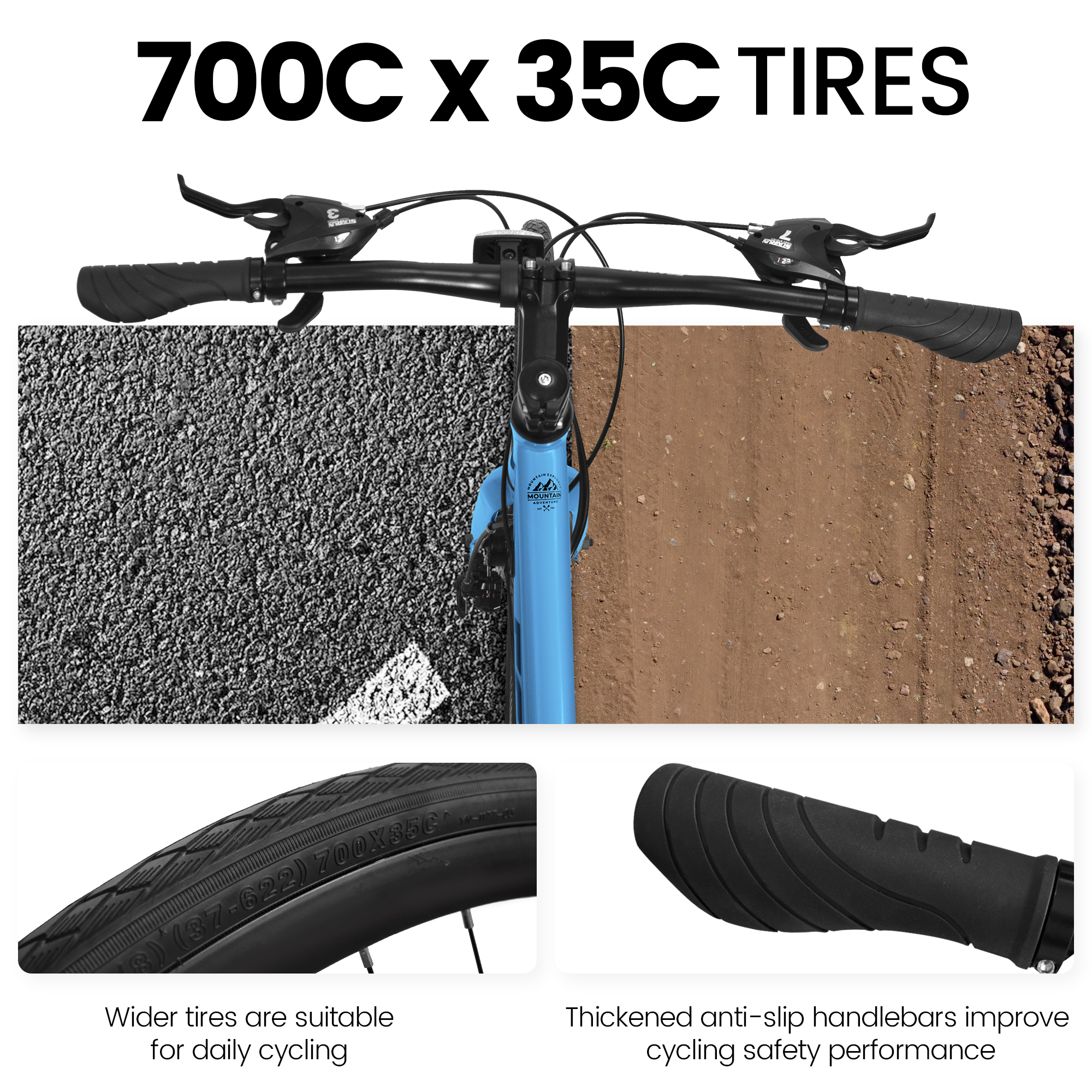 Durable 700Cx35 road bike with aluminum alloy wheels, 21-speed gear system, disc brakes, and wide tires, perfect for urban commuting and students.