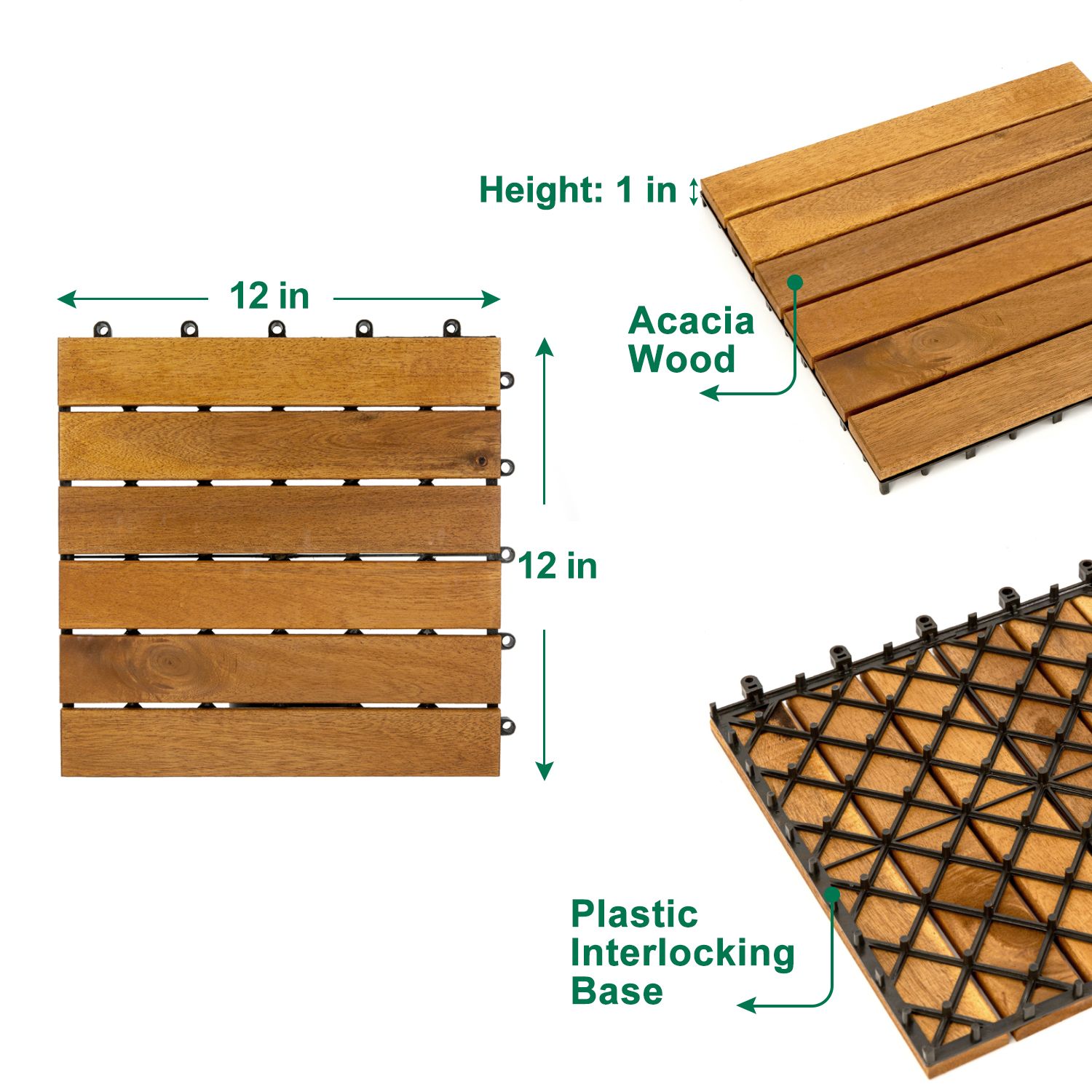 This set includes 10 assembled flooring tiles made from high-quality Acacia wood, each measuring 12 inches by 12 inches. The natural wood construction offers durability and an attractive, warm appearance suitable for various interior applications. Designed for easy installation, these tiles provide a stable and resilient surface that enhances the aesthetic appeal of any room. The uniform size allows for versatile layout options, making this pack a practical choice for both residential and commercial flooring projects.