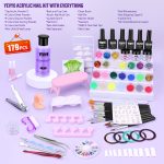 Complete acrylic nail kit featuring UV light, 4 gel polish colors, 24 glitter acrylic powders, and monomer liquid for professional results.
