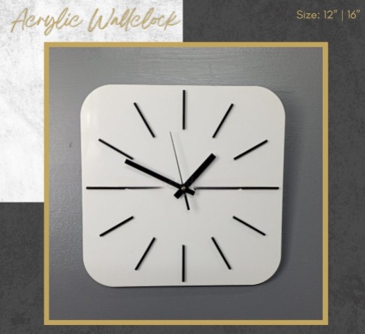 Elegant acrylic square wall clock featuring a white and black design, ideal for modern interiors and precise timekeeping.