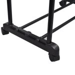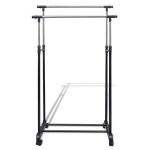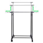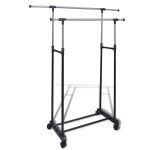 Durable adjustable clothes rack featuring two rails and four wheels for easy mobility and versatile garment storage.