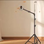 Durable metal tripod with telescopic arm ideal for indoor and outdoor mobile phone photography and live streaming.