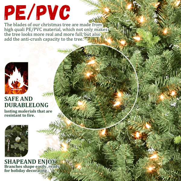 7ft artificial Christmas tree with mixed PE PVC branch tips, 450 warm white LEDs, memory wire, hinged foldable base for indoor holiday décor.