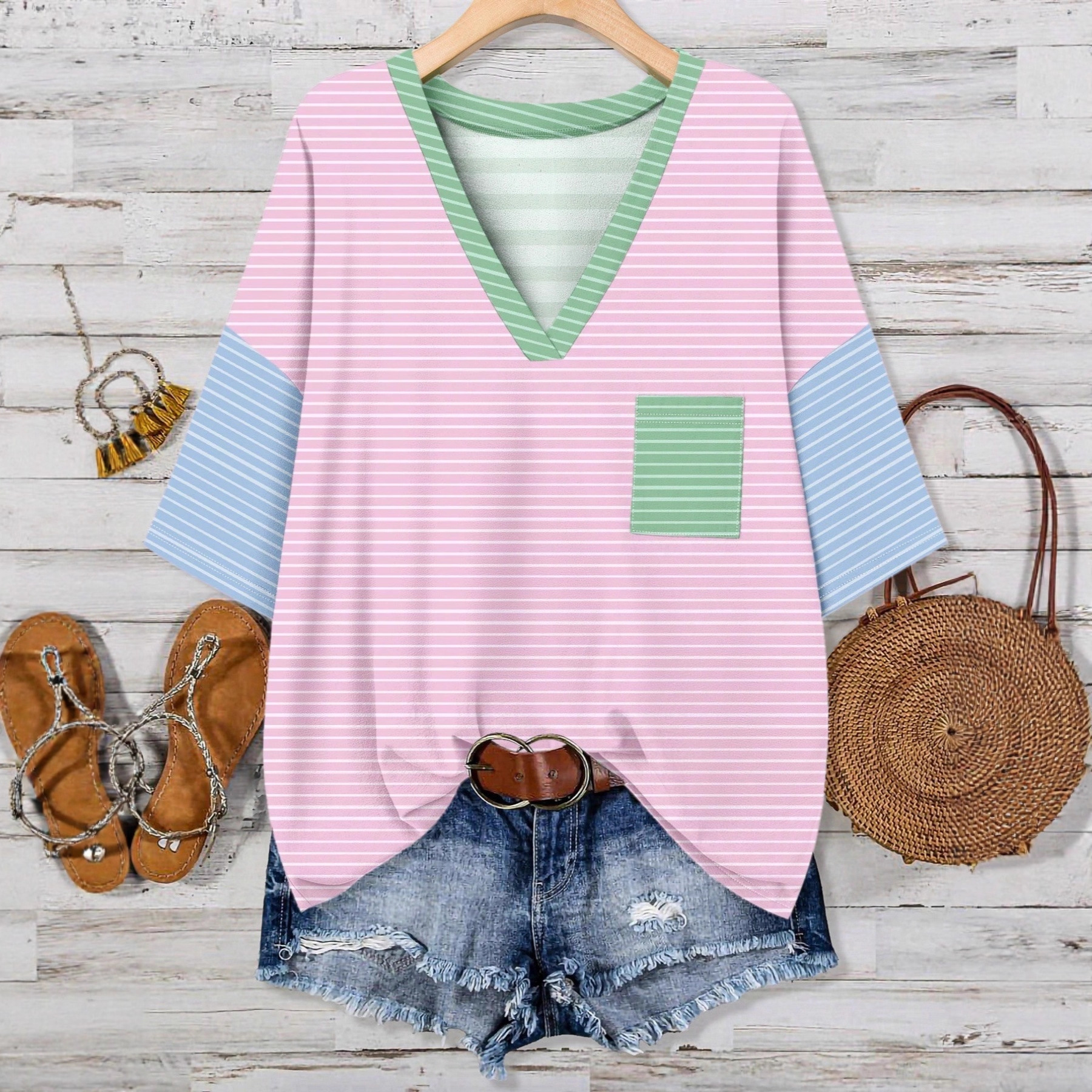 Stylish relaxed-fit top featuring a slimming V-neckline, 3/4 sleeves, and practical pocket for everyday comfort and casual elegance.