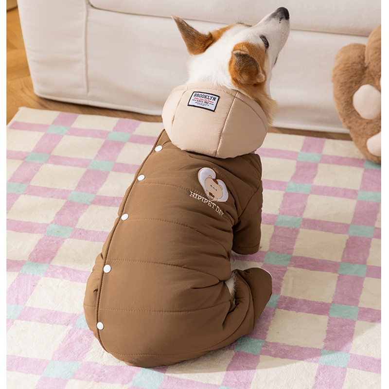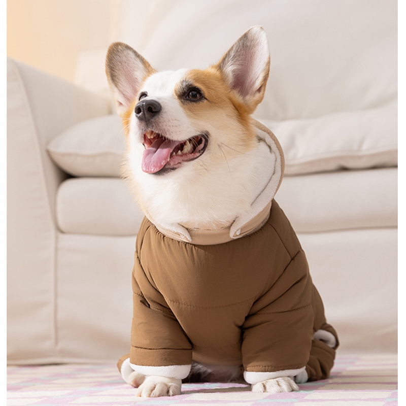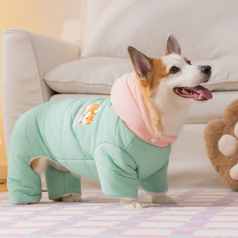 Designed specifically for medium-sized dogs, this autumn and winter corgi outfit features thick, warm cotton fabric ensuring comfort and insulation. The four-legged design provides full coverage, while the detachable hood offers versatility depending on weather conditions. This durable pet clothing combines functionality with style, making it suitable for colder seasons to keep your dog warm and protected.