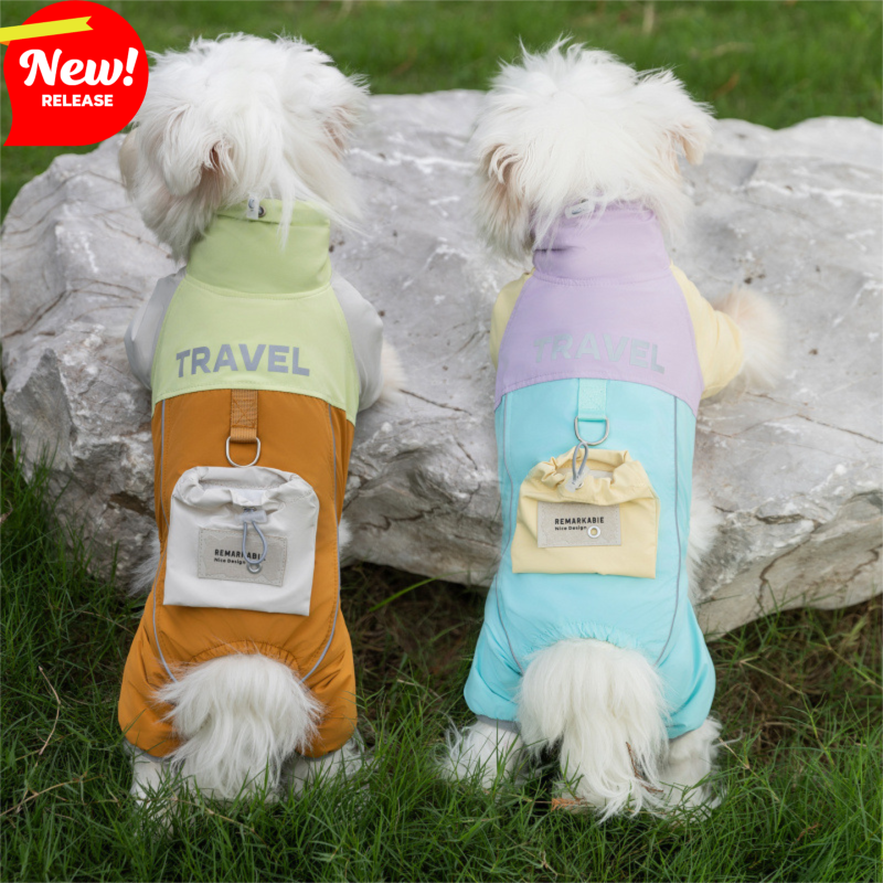 Durable four-legged cotton jacket for pets, ideal for autumn and winter outdoor activities. Windproof, warm, and comfortable travel backpack clothing.